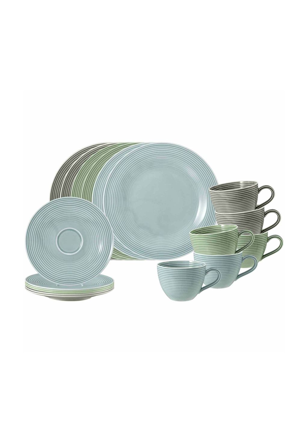 Кофейный сервиз на 6 персон содержит: - 6 кофейных чашек (по 2 жемчужно-серого, шалфейно-зеленого и арктического синего цветов)
