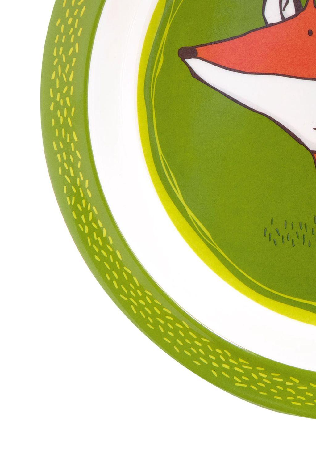Милая тарелка с изображением милой лисы, скошенный край и практичный размер диаметром 21,5 см способствуют самостоятельному питанию.