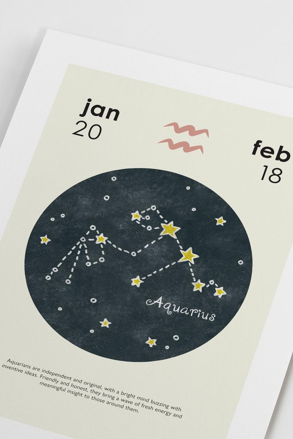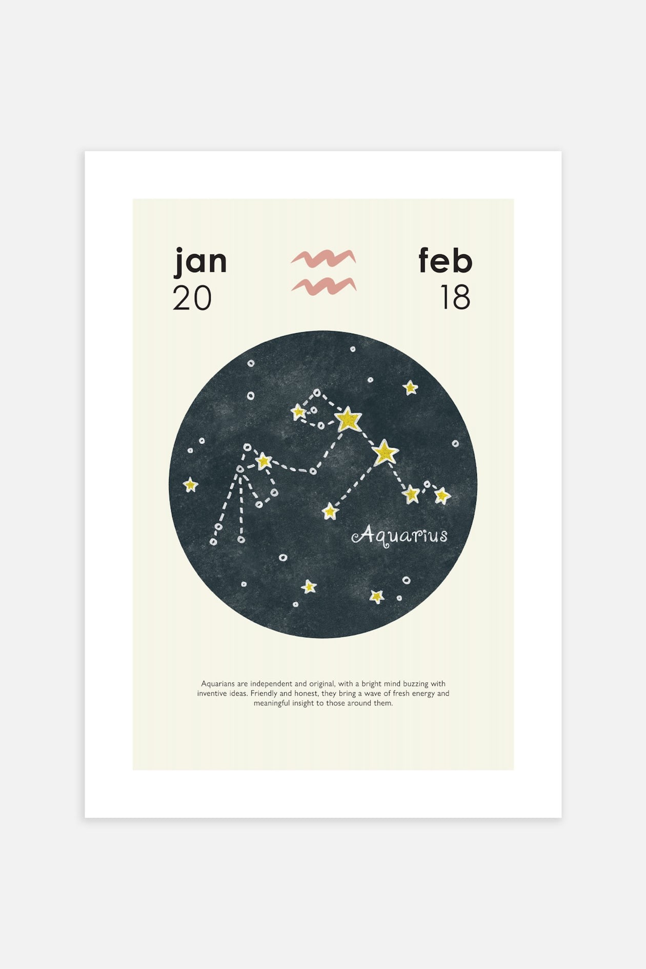 Созвездие Водолея, нарисованное белыми и желтыми мелками в стиле детского мультфильма на текстурированном фоне. На плакате, выполненном художницей Юлией Ткачевой, также изображены даты по знаку зодиака и символ в верхней части. Элементы зодиака написаны внизу, что придает им интересный и индивидуальный вид. Встроенная белая рамка элегантно обрамляет тему.