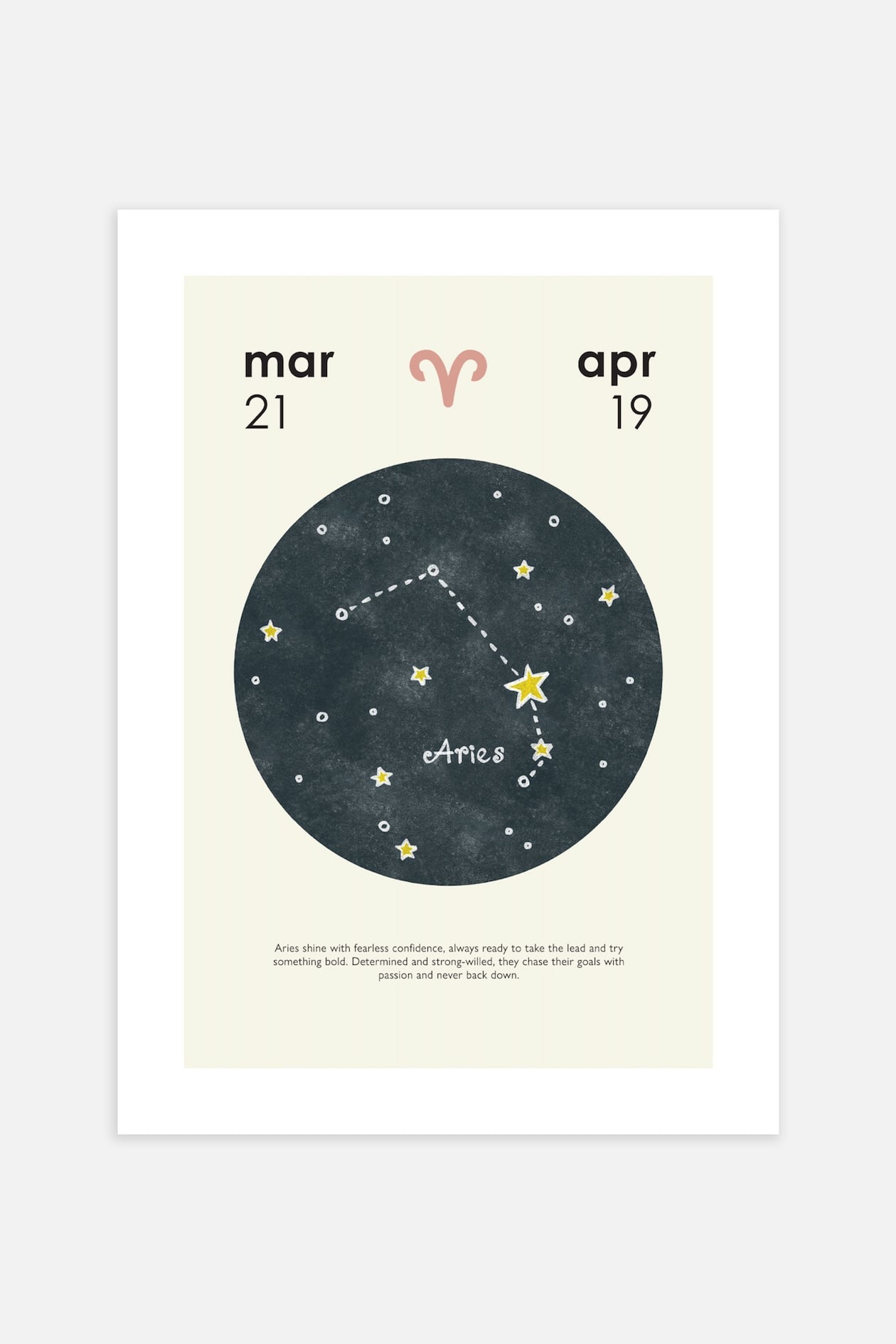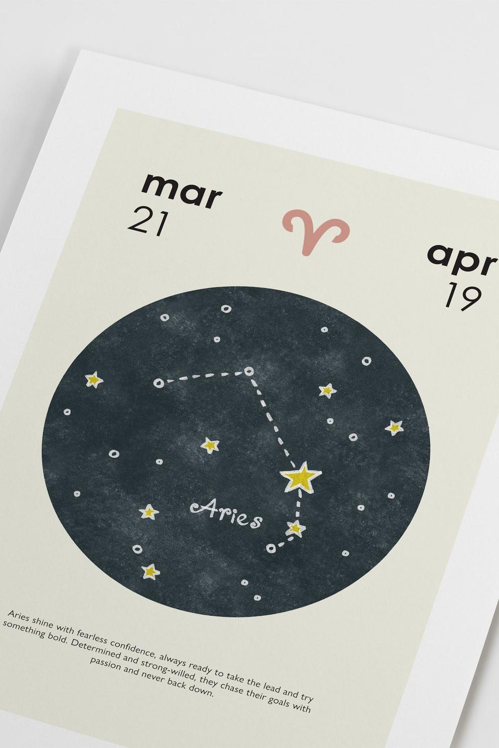 Созвездие Овна, нарисованное белыми и желтыми мелками в детском мультяшном стиле на текстурированном фоне. На этом плакате с изображением знаков зодиака, выполненном художницей Юлией Ткачевой, также выделяются даты и символы в верхней части, а элементы, написанные внизу, придают ему интересный и индивидуальный вид. Встроенная белая рамка элегантно обрамляет тему.