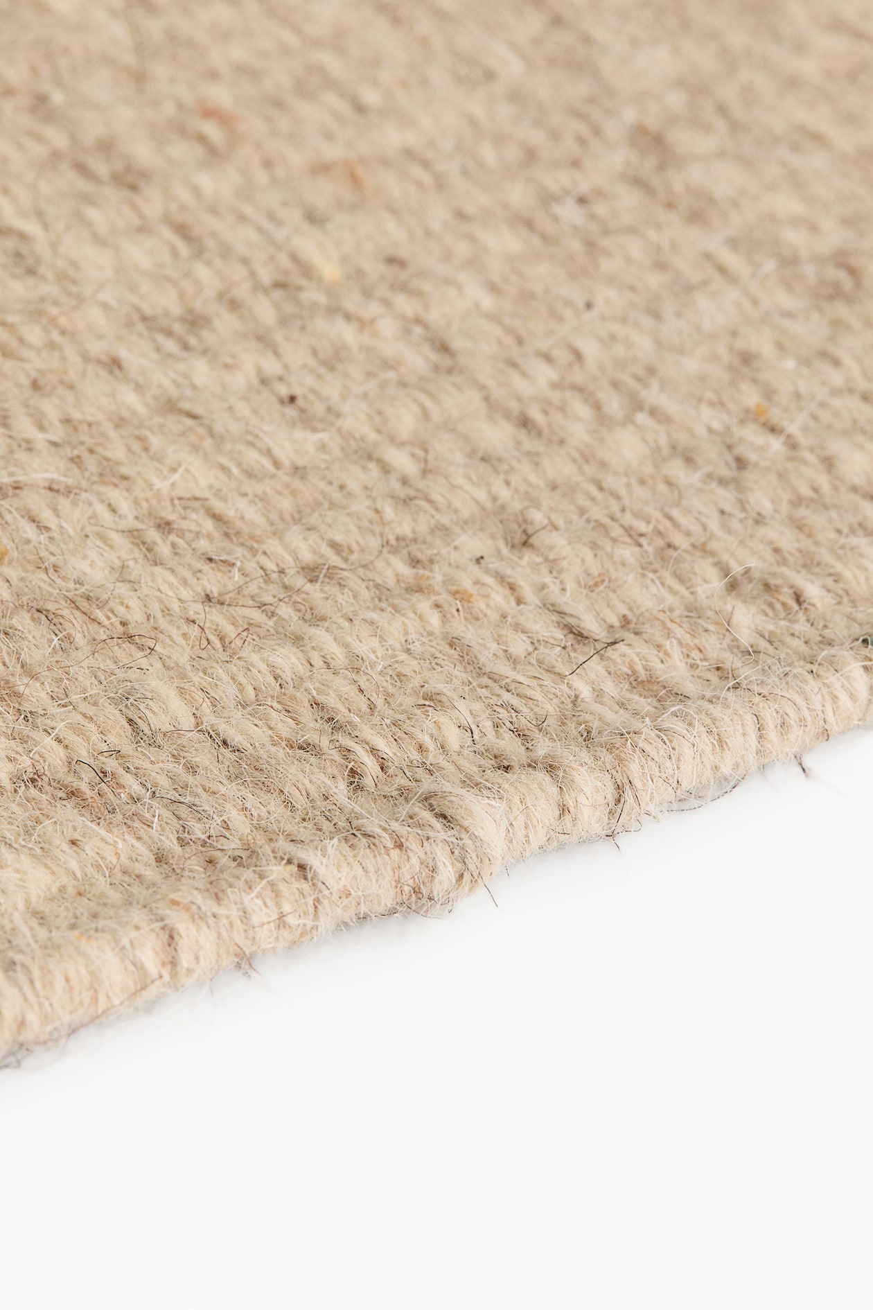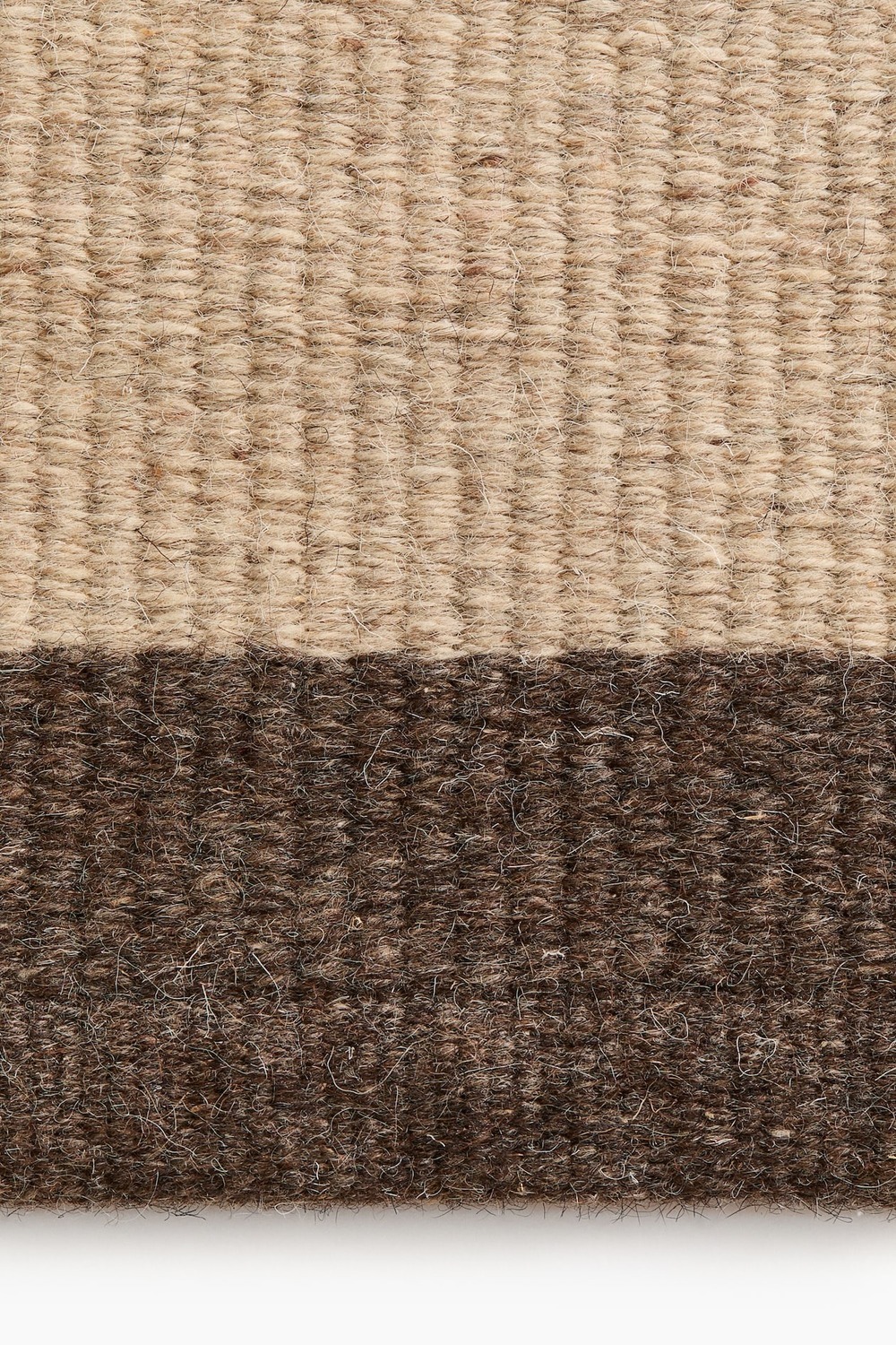 Большой ковёр плоского плетения из шерстяной смеси. Короткие края более тёмного оттенка. Обратите внимание, что новые ковры иногда имеют лёгкий запах, который легко устранить проветриванием и пылесосом.