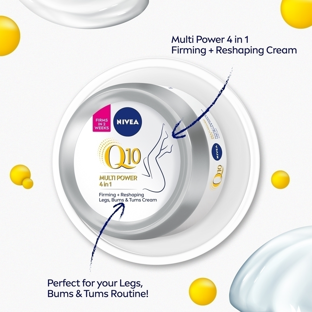 Забудьте об обвисании кожи! Укрепляющий и восстанавливающий крем «4 в 1» Nivea Q10 Plus «4 в 1» заметно подтягивает кожу проблемных участков тела, таких как живот, бедра или ягодицы, всего за 14 дней, делая ее более упругой и красивой. Интенсивно увлажняет кожу до 24 часов, придавая ей эластичность и мягкость. Продукт также можно использовать для зоны декольте и наносить на участки, пораженные целлюлитом.