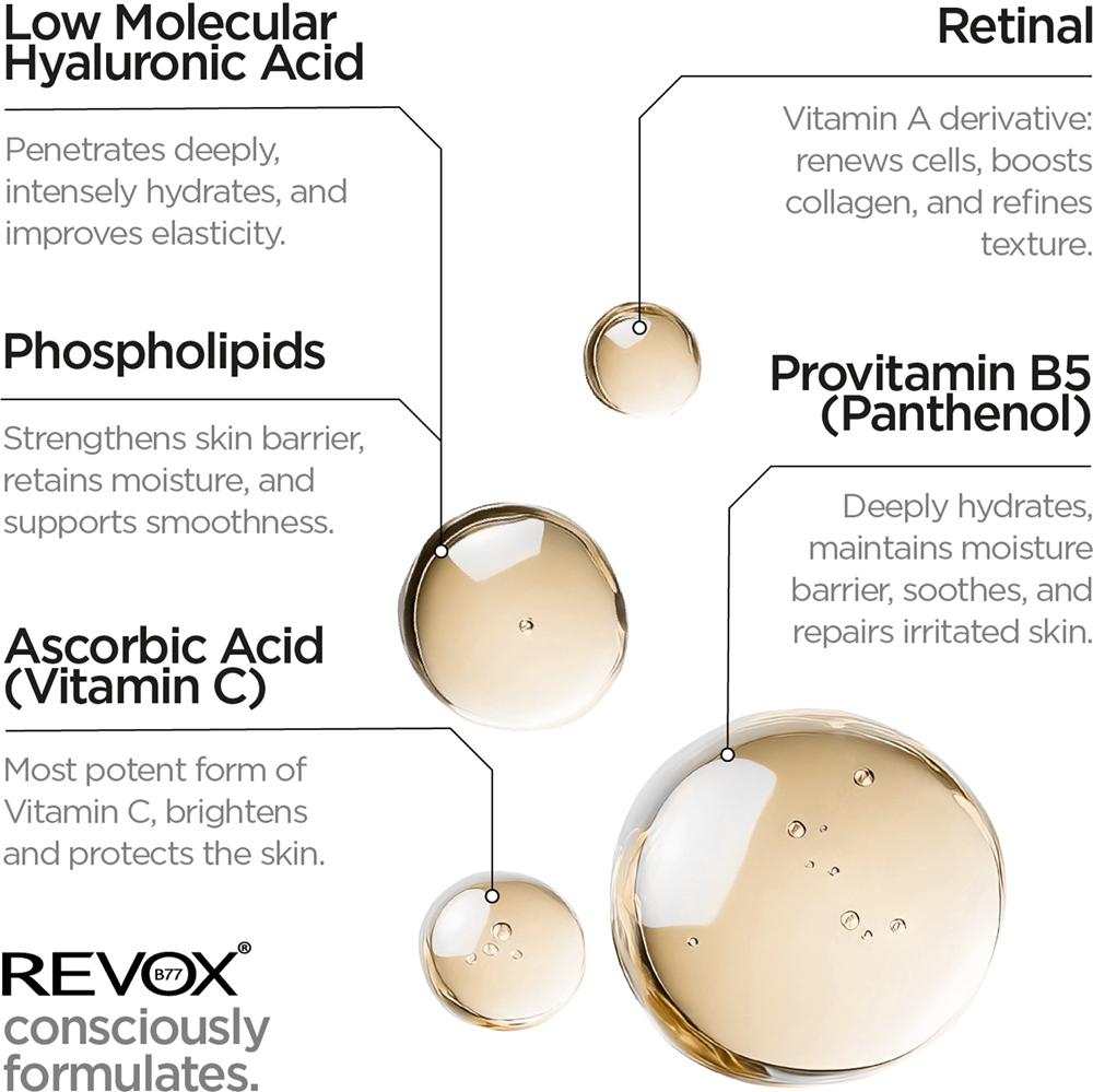 Думаете, вашей коже нужно больше, чем может предложить обычный крем? Сыворотка для кожи Revox B77 JUST Retinal Skin Serum обязательно дополнит ваш ритуал ухода, ваша кожа начнет сиять и получит интенсивный уход. Благодаря высокой концентрации активных ингредиентов, ее воздействие на кожу будет гораздо сильнее и быстрее, чем у других кремов для кожи. Продукт легко наносится благодаря своей жидкой текстуре, которая мгновенно впитывается в кожу.