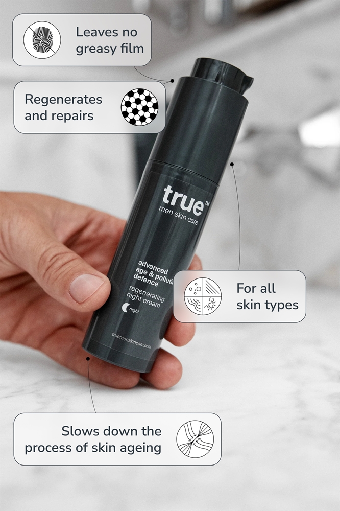 За кожей также следует ухаживать вечером. Ночной уход True Men Skin Care Регенерирующий ночной крем ухаживает за кожей, пока вы спите, и обеспечивает ее всем необходимым.