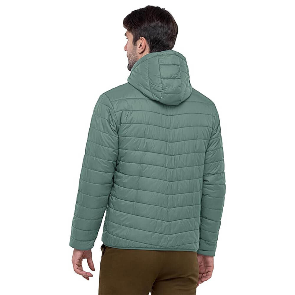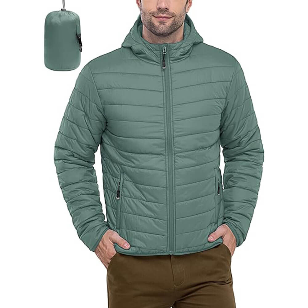Пуховик на застежке молнии, с капюшоном.