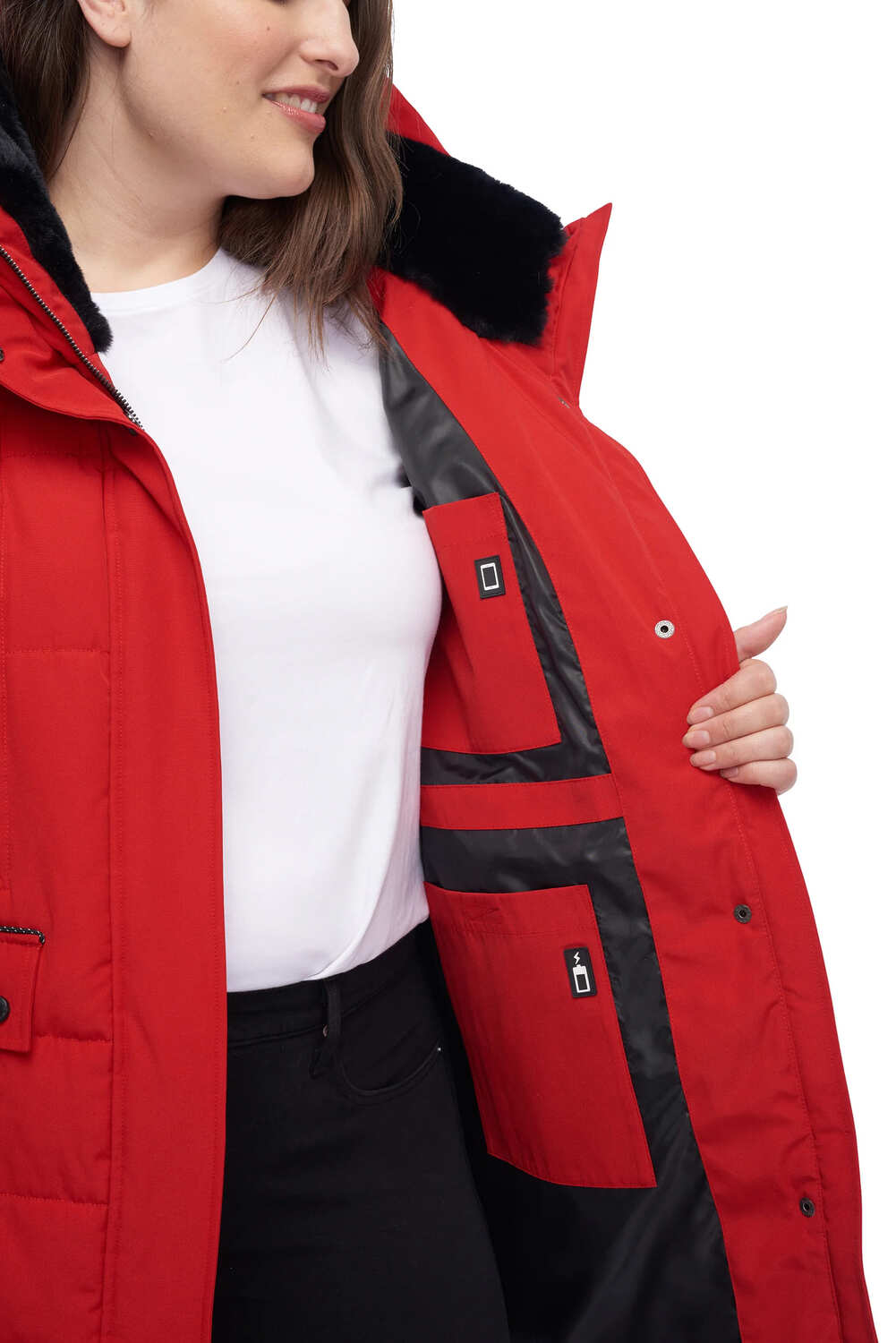 Куртка средней длины из водоотталкивающей и ветрозащитной ткани с наполнением из веганского пуха. Выдерживает зимние температуры значительно ниже нуля (до -30°C). Манжеты в рубчик с отверстиями для большого пальца, функциональные внешние карманы, внутренние накладные карманы для мобильного телефона и зарядного устройства, регулируемый капюшон, искусственный мех внутри воротника, светоотражающие детали отделки, застежка на молнию и кнопки.