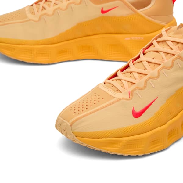 Nike представила свои футуристические, скульптурные кроссовки Ava Rover в свежей и яркой цветовой палитре «Золото и малиновый», которая сразу же приковывает взгляд. Благодаря пикселизированной подошве с кратерами, это, без сомнения, самый прогрессивный силуэт Nike, дополненный легкой, но массивной промежуточной подошвой из пеноматериала ReactX и отзывчивой амортизацией. Сочетая в себе элементы повседневной обуви и скульптурных беговых кроссовок, эта модель - воплощение инноваций в чистом виде.
