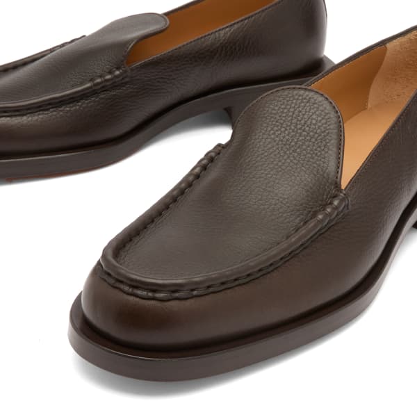 Саймон Порт Жакмюс - самоучка, но чувство меры и игривости - его вторая натура. Эти лоферы из темно-коричневой мятой кожи воплощают изысканность при каждой носке. Для уникальности одна модель имеет квадратный каблук, а другая - округлый.