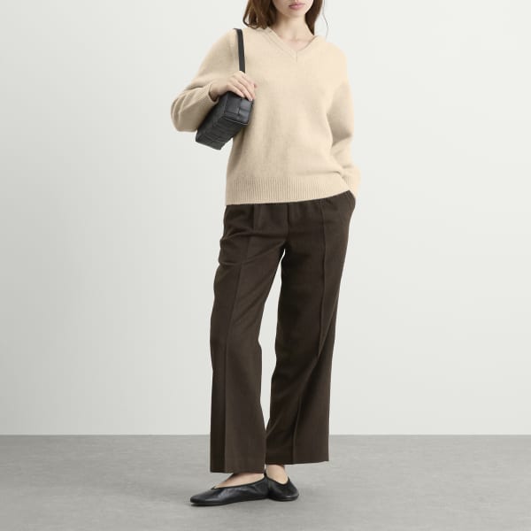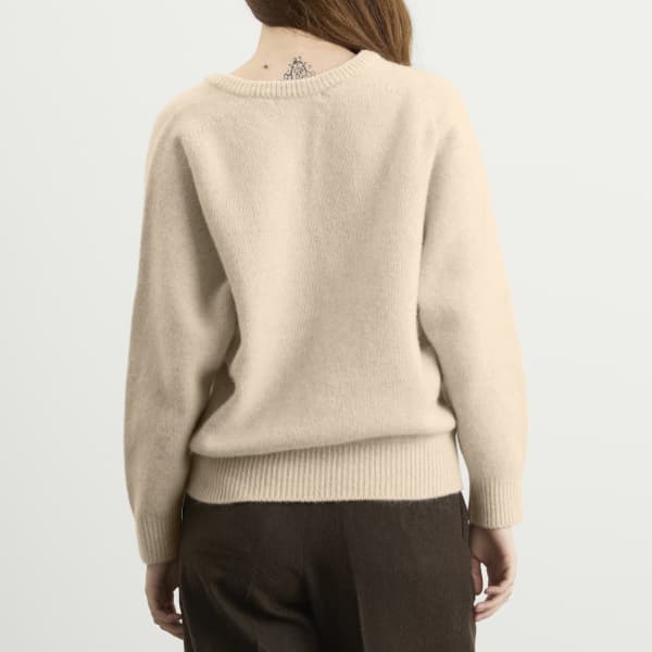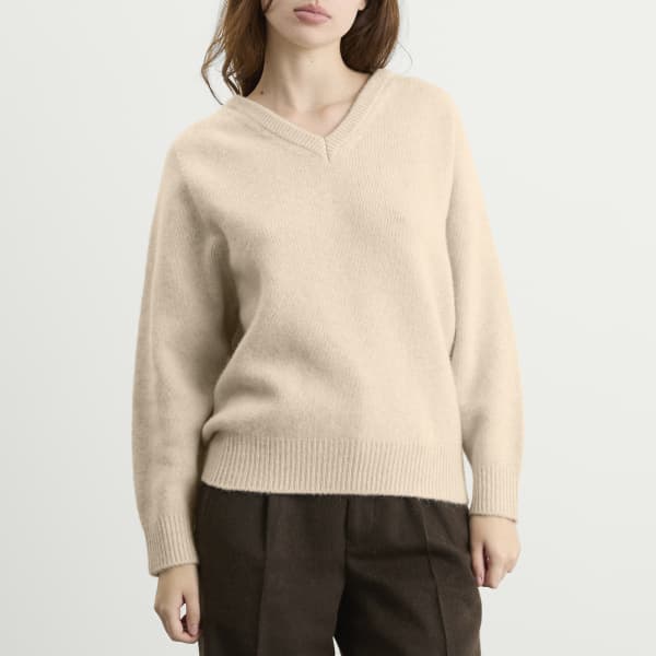 Nothing Written славится своей сдержанной элегантностью и продуманным дизайном. Свитер из альпаки фунта, фирменная вещь, сочетает в себе пряжу беби альпака и шерсть, обеспечивая исключительное тепло и мягкость без утяжеления. Изящный V-образный вырез и свободный силуэт позволяют создавать многослойную одежду, а плотные ребристая окантовка сохраняет форму и добавляет структуру - идеальный вариант для непринужденного зимнего образа.