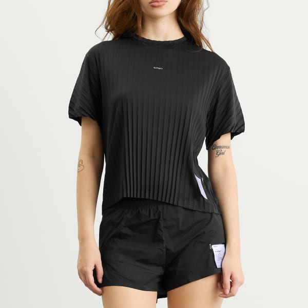 Satisfy представляет японскую ткань AuraLite в этой плиссированной футболке - переработанный микроджерси, легкий, как перышко, мягкий как шелк, созданный для движения. Быстросохнущая, влагоотводящая, устойчивая к запахам и защищающая от ультрафиолета, она гнется вместе с вами в любых условиях. Рельефные складки улучшают циркуляцию воздуха и уменьшают трение, что делает ее идеальной для прохладного старта и интенсивных занятий.