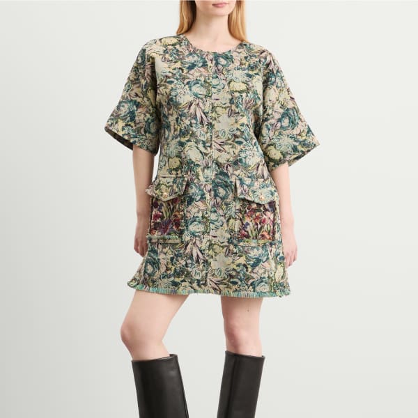 Копенгагенский бренд GANNI, известный своей игривой интерпретацией скандинавского стиля, привносит богатую фактуру и визуальную глубину в мини-платье-кимоно свободного кроя благодаря узору, вдохновленному гобеленом. Ткань имеет плетение, напоминающее винтажную обивку - замысловатые цветочные узоры и приглушенные тона. Это смелое, но практичное решение, сочетающее в себе фирменный неординарный шарм бренда и отсылку к традициям ремесла. Открытая спина, завязки и свободный силуэт делают его современным и простым в стилизации.