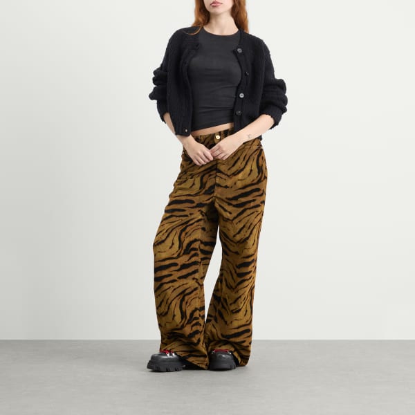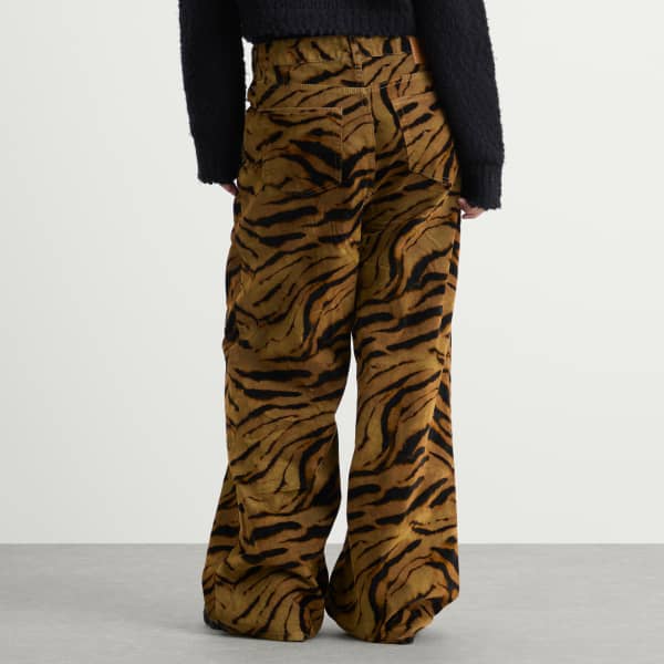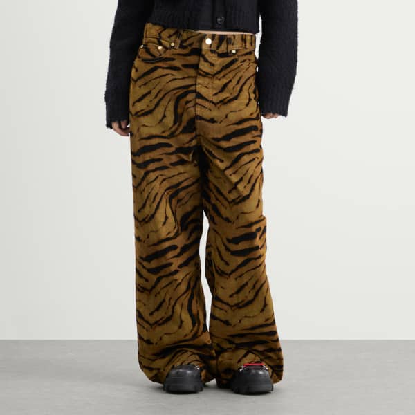 GANNI, копенгагенский бренд, известный своими яркими принтами и игривыми пропорциями, привносит фактуру и индивидуальность в джинсовую ткань с помощью мешковатых джинсов с принтом из флокированного денима. Джинсы изготовлены из переработанного хлопка, отличаются свободным кроем и пятью карманами. Яркая деталь - флокированный тигровый принт, который придает силуэту бархатистую глубину и дикую энергию.