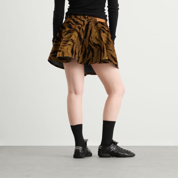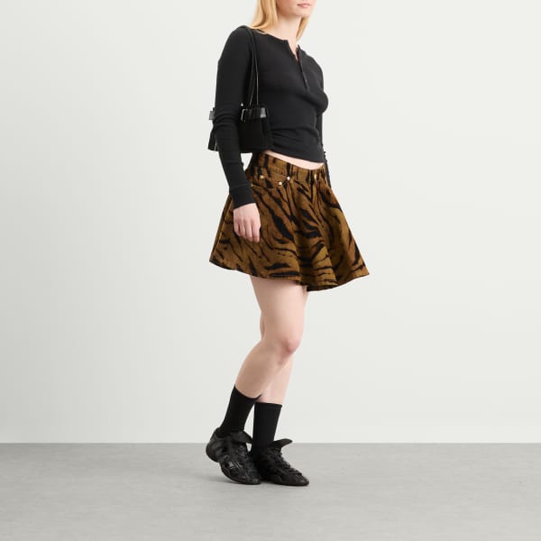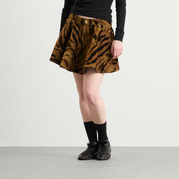 GANNI, копенгагенский бренд, известный своими смелыми принтами и игривыми пропорциями, выделяется фактурой в мини-юбке из принтованного денима с ворсистым принтом. Яркий тигровый принт, создающий бархатистую, рельефную поверхность, добавляет дизайну энергичности. Модель выполнена из переработанного хлопка, имеет забавный расклешенный силуэт и дополнена нашивкой с логотипом GANNI сзади.