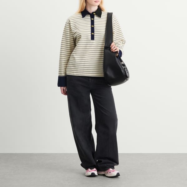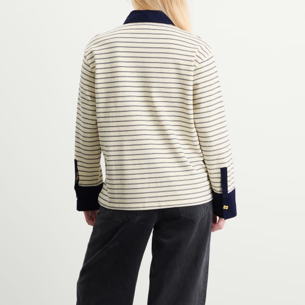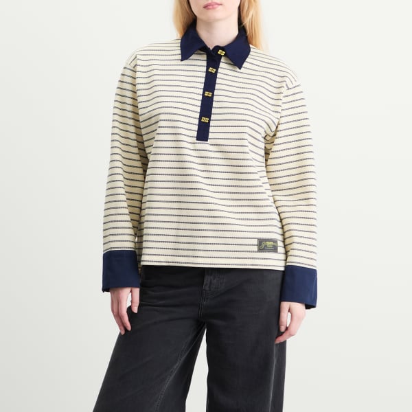 GANNI привносит свою фирменную изюминку в тренд регбийного поло, делая это так, как умеет только GANNI - смело и игриво. Логотип-бабочка занимает центральное место благодаря эффектным золотистым пуговицам, застегивающим как контрастную планку, так и манжеты. В этой спортивной модели элегантный стиль сочетается с характером девушки Ganni.