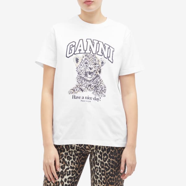 Всегда опережая тренды, GANNI выводит леопардовый принт на новый уровень в этой свободной футболке. Футболка сочетает в себе комфорт и стиль. Она сшита из роскошного органического хлопка с игривым леопардовым принтом спереди и культовым логотипом GANNI. Стильная и современная, эта футболка добавит индивидуальности и непринужденности вашему повседневному образу.