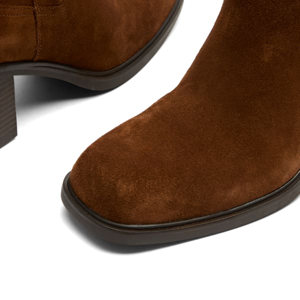 Vagabond Shoemakers сочетает скандинавскую простоту с высоким мастерством в высоких сапогах Meryl. Выполненные из насыщенной коричневой замши, они имеют трубчатый силуэт, декоративную строчку и закругленный носок для мягкости. Короткая внутренняя молния обеспечивает удобство при надевании, а блочный каблук со шпоном добавляет высоты. Стелька из кожи без хрома - изысканный баланс элегантности и повседневного стиля.