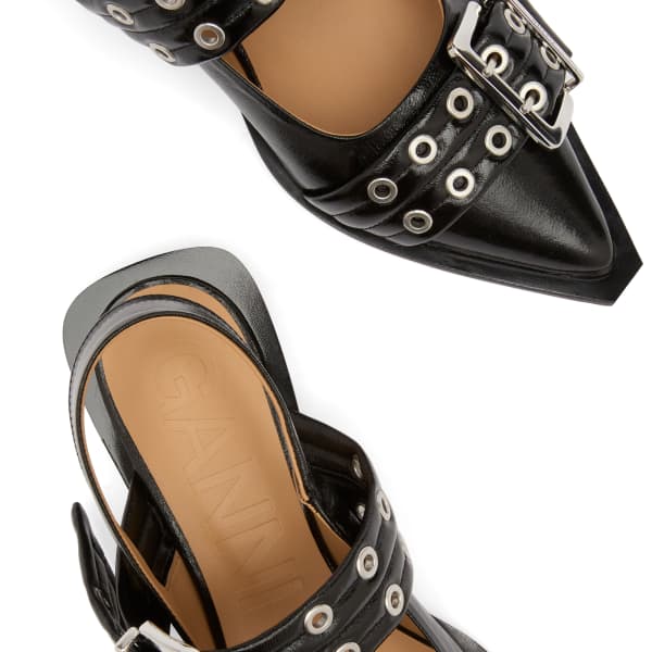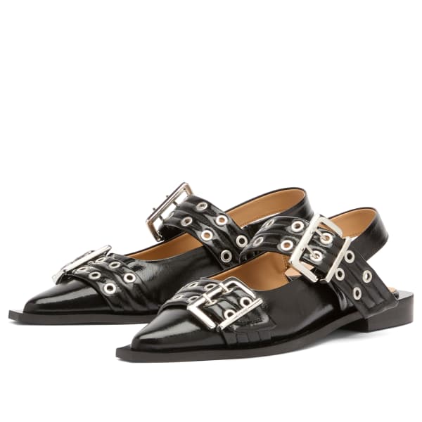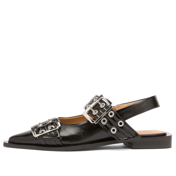 GANNI, известная своим игривым, но изысканным подходом к современной моде, представляет женственные балетки с пряжкой - свежий взгляд на вневременную элегантность. Они придают неповторимую индивидуальность любимым балеткам: заостренный силуэт, ремешок с открытой пяткой и серебристая пряжка с выгравированным логотипом бренда. Откройте в себе внутреннего законодателя моды и окунитесь в мир GANNI.