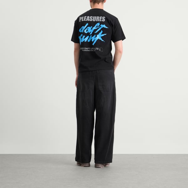 Футболка Pleasures снова добавит в ваш гардероб фирменную яркую графику. Футболка - часть эксклюзивного сотрудничества, на груди изображен электронный дуэт Daft Punk.