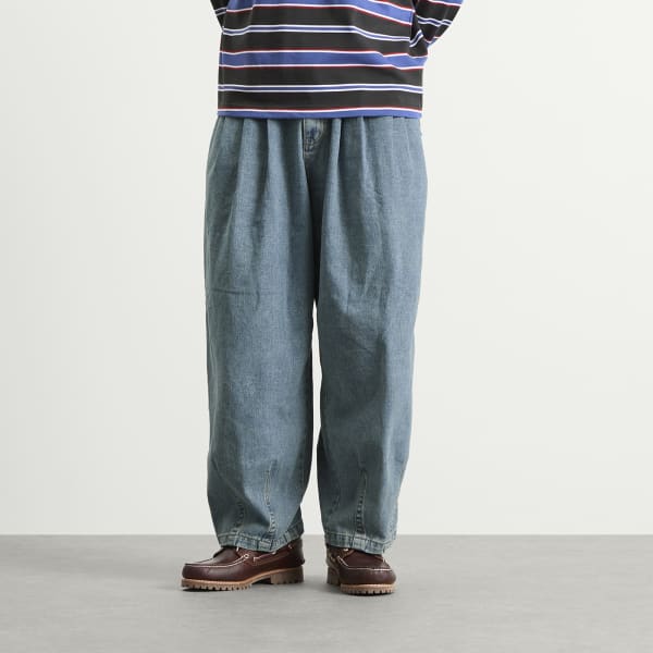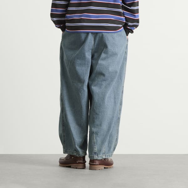 Брюки-баллоны Anglan, изготовленные из хлопкового денима плотностью 7 каунтов, с тройной вытачкой на подбородке и био-стиром Stone Bio Washing, создают мягкий винтажный вид. Полуэластичный пояс и карманы с клапанами сочетают комфорт и практичность. Небольшая деталь на этикетке напоминает о сеульских корнях Anglan и его тихом мастерстве свободного покроя.
