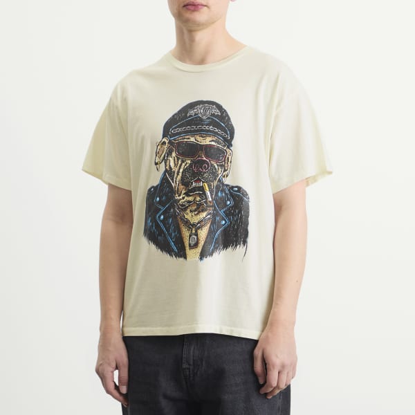 Gallery Dept, лос-анджелесский бренд, основанный художником Хосе Томасом и известный своей смелой графикой и винтажными силуэтами, делает акцент на выцветшем изображении собаки-байкера спереди в этой эффектной футболке. Свободный крой в стиле 90-х создает непринужденный образ, а логотип GD ENGLISH на спине, выполненный золотыми блестками, добавляет контраста и фактуры.