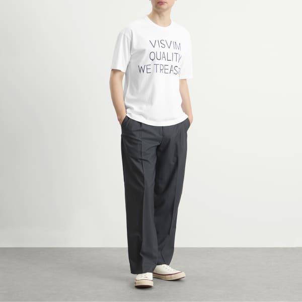 Футболка Visvim, воплощающая прогрессивную японскую моду высокого класса с элементами уличной моды, имеет свободный силуэт. На груди фирменный принт «Quality We Treasure» с эффектом потертости.