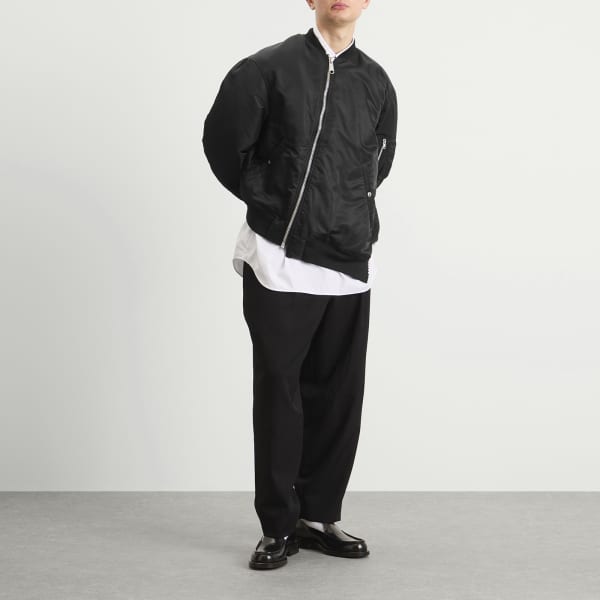 Этот асимметричный бомбер, созданный Comme des Garçons Black в монохромном стиле, переосмысливает структуру. Выполненный в насыщенно-черном цвете с четкими, нестандартными линиями, он представляет собой смелое исследование силуэта, где практичность сочетается с авангардной точностью.