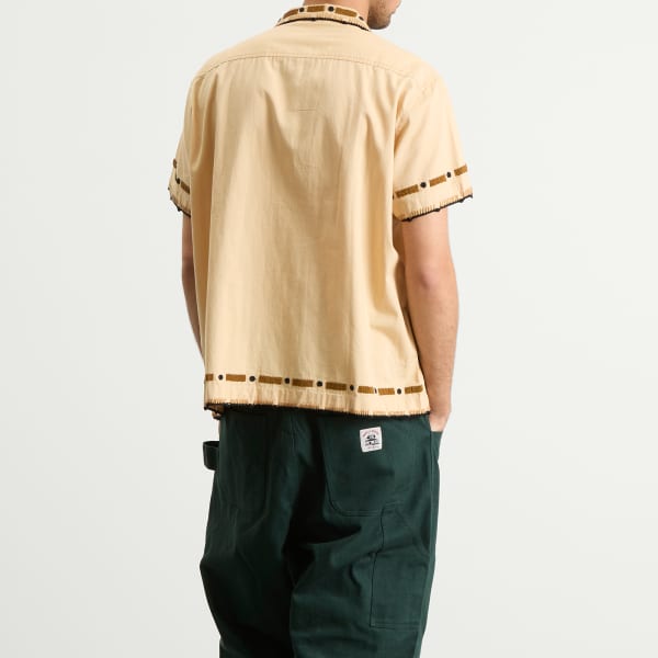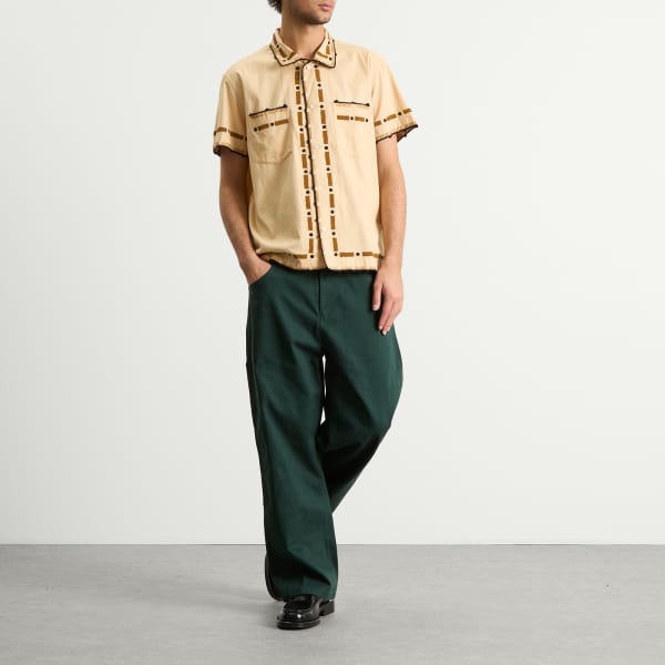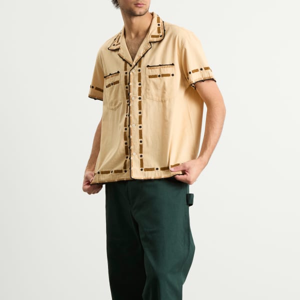 Bode известен своим мастерством повествования, возрождая исторические ткани с помощью кропотливой ручной работы и современных силуэтов. Расшитая бисером рубашка с коротким рукавом из райграса вдохновлена народной скатертью 1930-х годов, переосмысленной с помощью вышивки бронзовыми бусинами и плотной стеганой строчки. Каждая бусина пришита вручную, превращая свободную рубашку в изысканное произведение искусства.