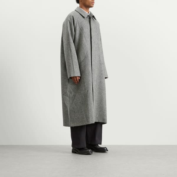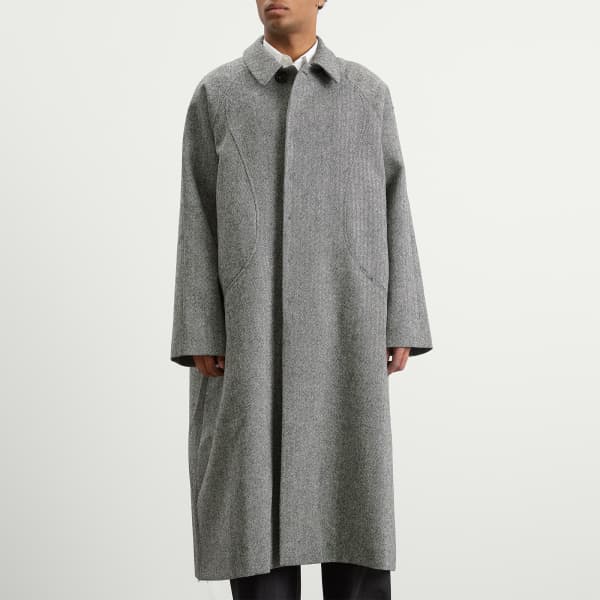 Sage Nation не интересуется быстрой модой. Главное - продуманный дизайн, отдающий дань уважения двум культурам, сформировавшим его основателя, - британской и японской. Пальто Takeshi, высоко ценимое в качестве официального наряда, сшито из струящейся шерсти с узором «елочка» и сочетает в себе классические и уникальные детали: съемный воротник, свободный крой и закругленные швы.