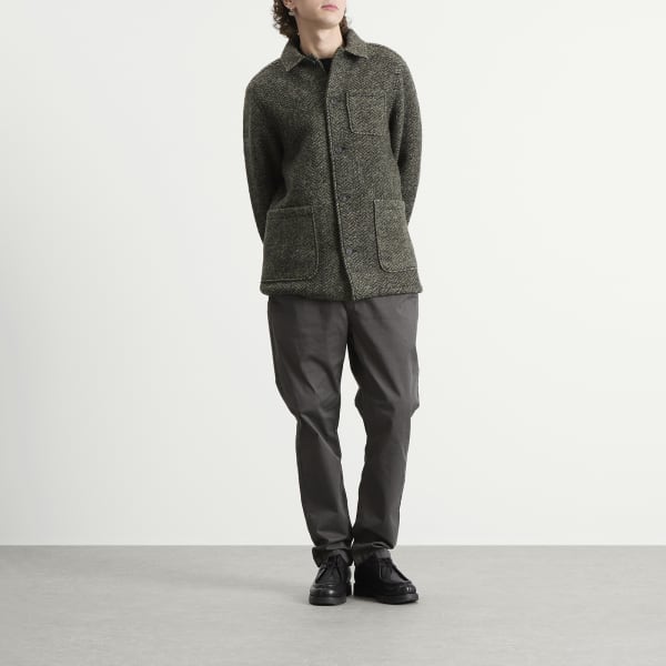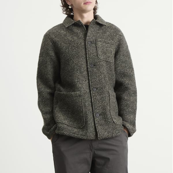 Kestin, бренд, известный своей современной рабочей одеждой и шотландским текстильным наследием, представляет новую интерпретацию классической плотницкой куртки Ormiston. Куртка выполнена из теплой шерстяной ткани с тонким плетением «елочка» (в елочку), имеет три накладных кармана спереди и два боковых кармана для инструментов, сочетая практичность с лаконичной текстурой. Свободный крой и силуэт пальто для работы делают эту прочную и элегантную модель идеальной для повседневной носки.