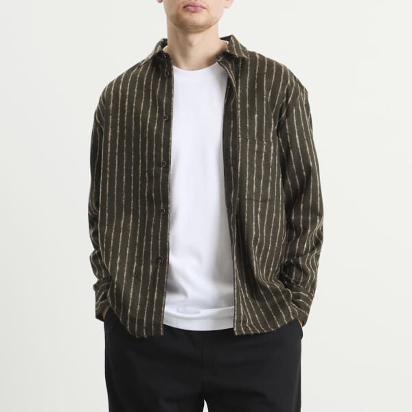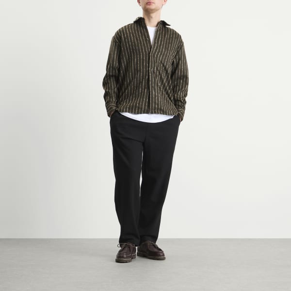 Рубашка Gusto от A Kind of Guise возвращается с новой смелой текстурой, оставаясь верной своему популярному свободному силуэту. Модель с обычным воротником, накладными карманами, боковыми разрезами и складкой сзади сочетает в себе свободный крой и четкие детали. Смесовая шерсть и мохер с рельефными полосками создает тактильный контраст - мягкая на ощупь, но при этом достаточно структурированная, чтобы уверенно держать форму.