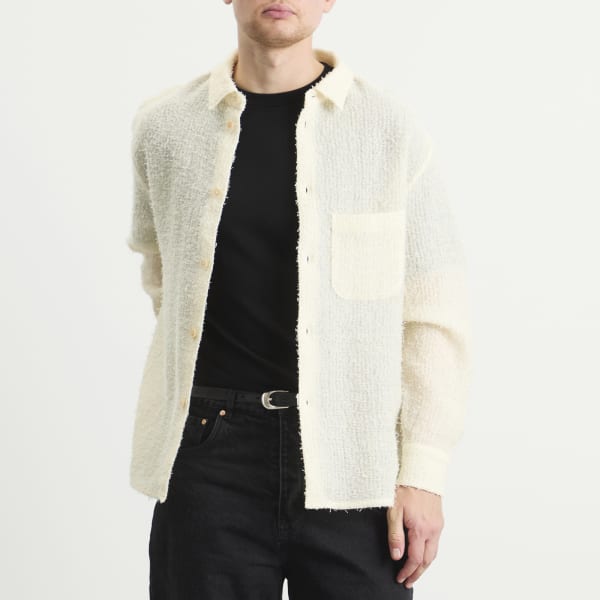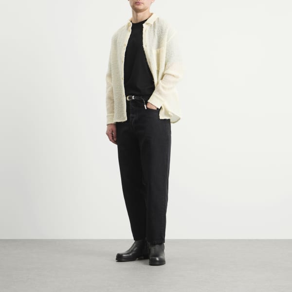 Рубашка A Kind of Guise Gusto - воплощение изысканного стиля. Строгий воротник и едва заметная складка сзади создают непринужденный, но выразительный силуэт, дополненный боковыми разрезами и накладным карманом спереди. Полупрозрачная ткань из легкой смеси шерсти и шелка с тонкими петлями и мягким блеском добавляет текстуру, подвижность и сдержанную глубину минималистичному силуэту.