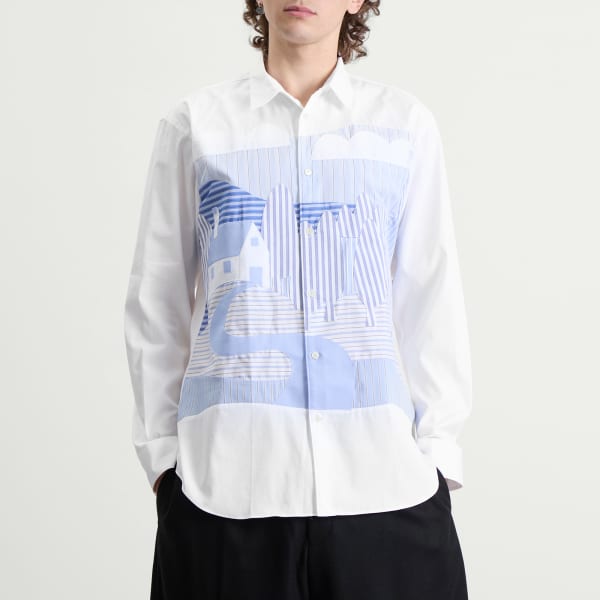 Рубашка Comme Des Garçons SHIRT из линейки Diffusion переосмысливает классические рубашки, предлагая игривый и изысканный дизайн с превосходным мастерством. Эта белая рубашка сшита из легкого, плотного хлопка и украшена абстрактным пейзажем - домом, деревьями и извилистой тропинкой, - сотканным из сине-белых вертикальных полос. Благодаря четким линиям и оригинальным деталям эта модель станет отличным дополнением к любому образу.