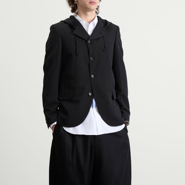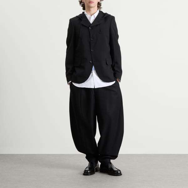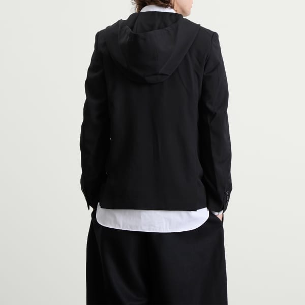 Comme des Garçons Black воплощает свою фирменную монохромную эстетику в этом эффектном блейзере с капюшоном. Этот эффектный блейзер с увеличенными лацканами, плавно переходящим в структурированный капюшон, мастерски сочетает в себе строгий роскошный крой и непринужденную уличную эстетику, создавая неожиданный гибрид, который одновременно изыскан и бунтарски выразителен.