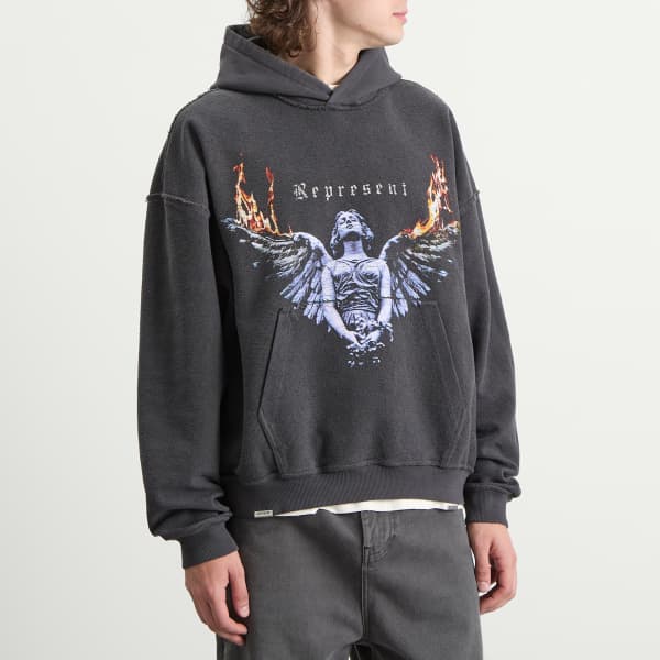 Represent продолжает стирать грань между уличной одеждой и историей, представляя худи Living Legacy Tour. Эта двухсторонняя модель выполнена из плотного хлопка, имеет свободный силуэт oversize и перекликается с фирменным стилем бренда. Комбинированная печать с обеих сторон создает двойную идентичность - от ярких принтов, вдохновленных турами, с многослойной типографикой до состаренных мотивов, - а легкая потертость и металлическая фурнитура создают ощущение поношенности и коллекционности. Эта вещь, дополненная отрывными этикетками для бесшовного ношения в двух направлениях, создана, чтобы выделяться.