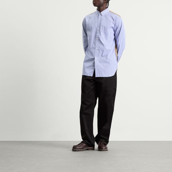 Рубашка из нейлона в полоску, созданная экспериментальным дизайнером Джуньей Ватанабэ Мэн, представляет собой гибридную модель, переосмысливающую классический стиль через технологичный подход. Рубашка с воротником на пуговицах и закругленным подолом выполнена из полосатого хлопка спереди и вставки из нейлоновой тафты сзади, напоминающей жилет, создавая неожиданный контраст. Нагрудный накладной карман и застежка на пуговицы завершают образ, сочетая элементы рабочей одежды с яркими деталями.