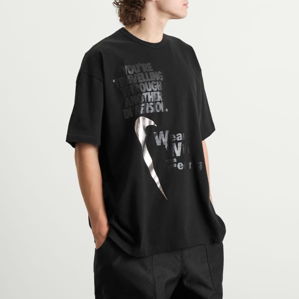 Футболка Comme des Garçons Black x Nike создана для того, чтобы носить ее с чувством. Эта футболка - часть продолжающегося эксклюзивного сотрудничества. Серебристая графика, выполненная в Японии, обладает футуристичным оттенком, создавая ощущение путешествия в другое измерение.
