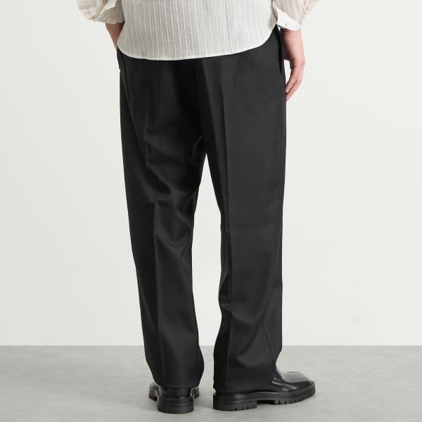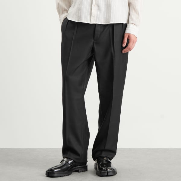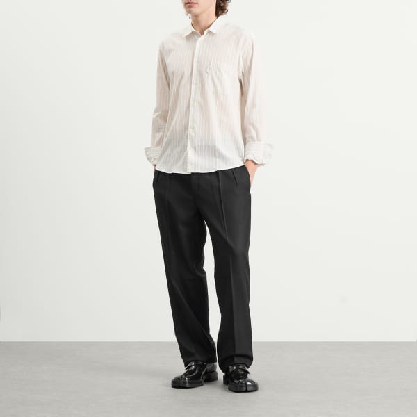 Брюки Maison Margiela структурированного силуэта из высококачественной натуральной шерсти имеют центральную складку и прорезные карманы по бокам для большей функциональности. Задний клапан и прорезной карман добавляют изделию легкого объема, а контрастная строчка сзади отсылает к фирменному стилю Margiela. Строгий, но сдержанный, этот универсальный предмет одежды создает изысканный образ.