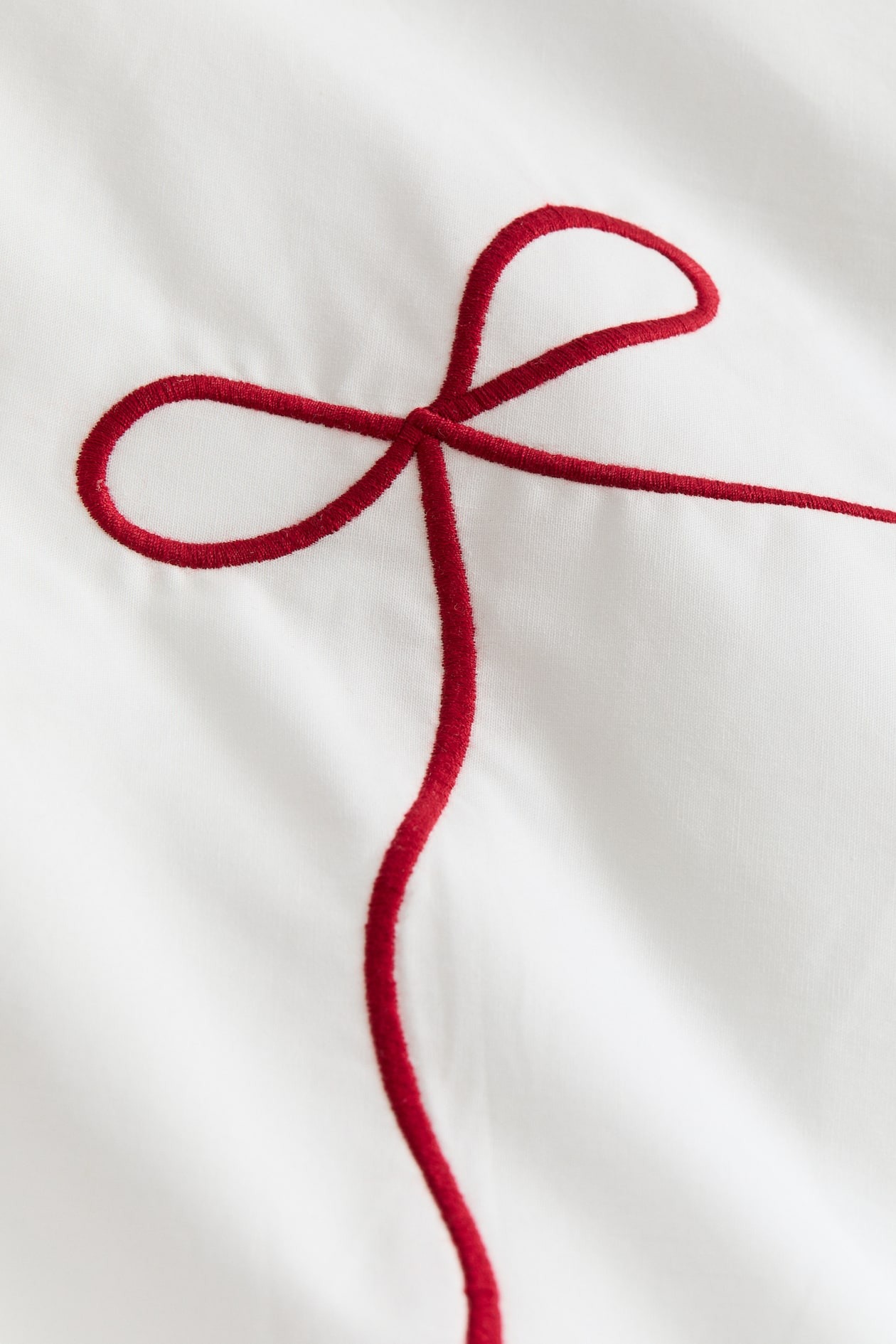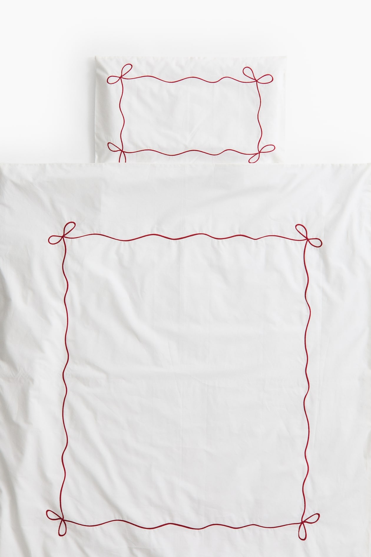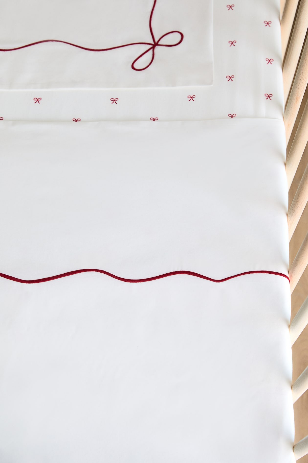 Этот комплект постельного белья для детской кроватки изготовлен из мягкой хлопковой ткани с простой вышивкой. Пододеяльник застегивается на кнопки снизу. В комплект входит одна наволочка в форме конверта.