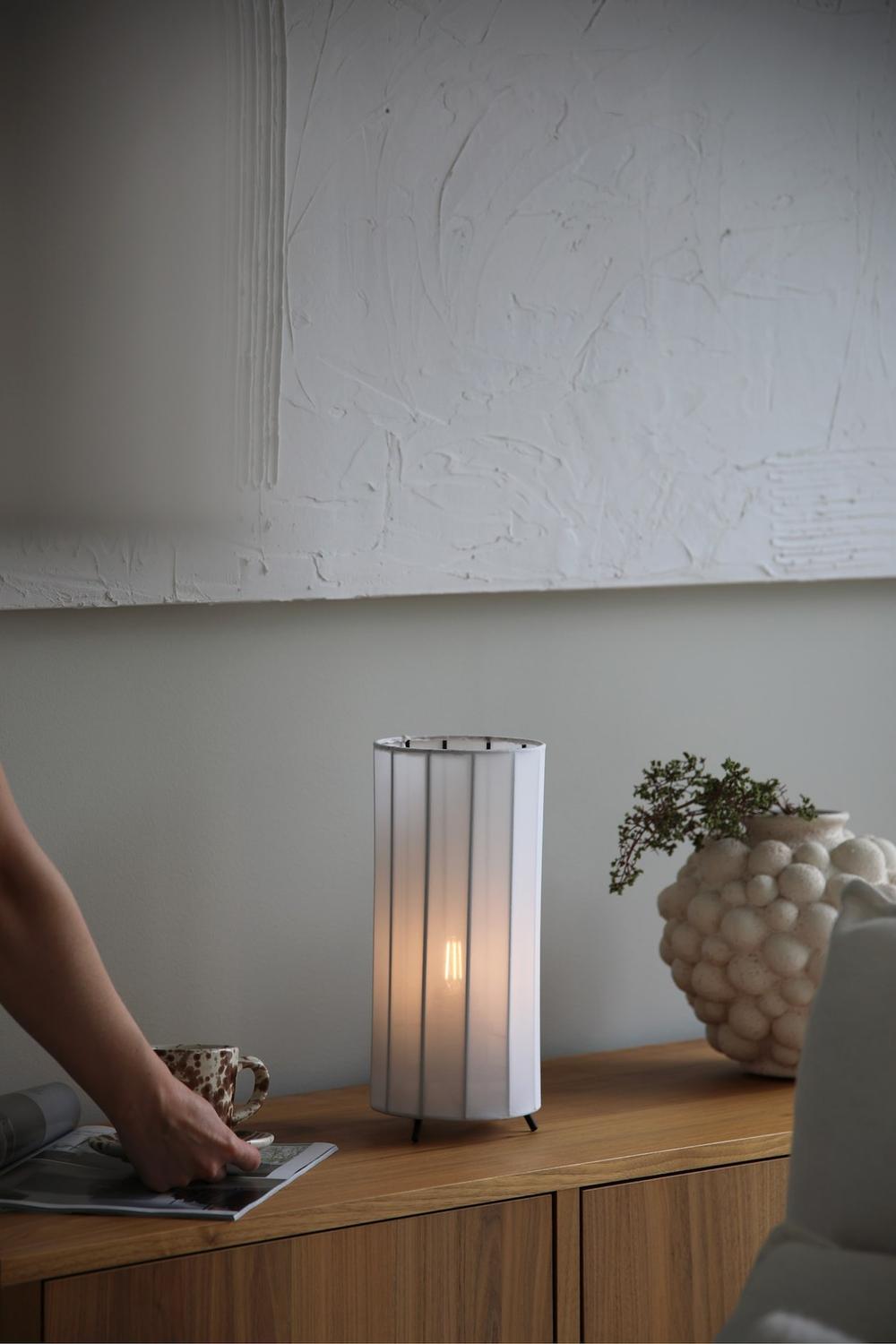 Настольная лампа с чёрным металлическим основанием и белым тканевым абажуром. Полупрозрачный абажур эффектно подчёркивает контраст чёрного металлического каркаса изнутри. Для лампы требуется источник света с большим цоколем (E27) мощностью не более 40 Вт или аналогичная светодиодная лампа; в комплект не входит. Чёрный тканевый кабель длиной 2 м с выключателем и вилкой.
