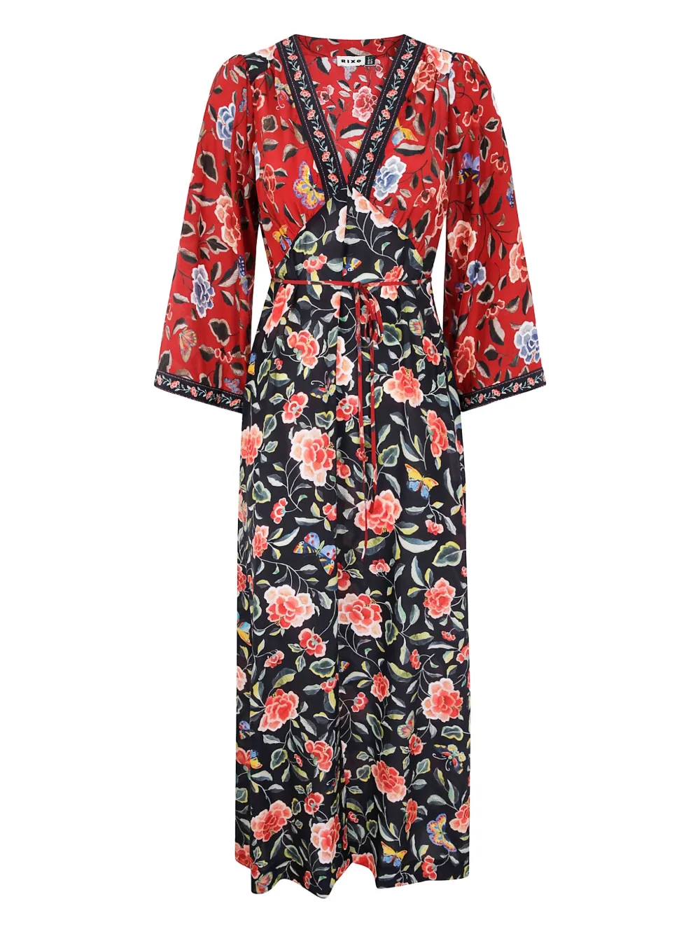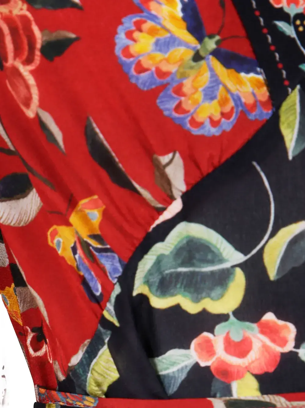 Черное платье с цветочным принтом, V-образным вырезом, рукавами 3/4 и поясом на талии