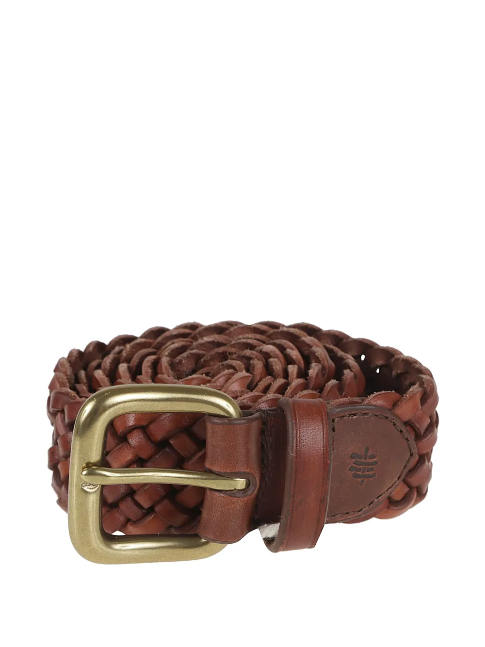 Коричневый "жженый" кожаный ремень с плетеным дизайном, пряжкой, фиксирующей петлей и логотипом