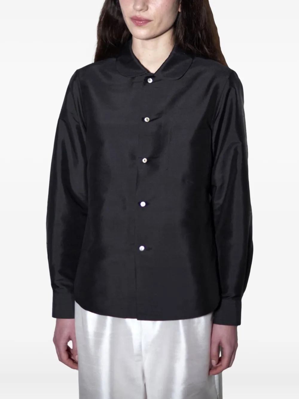 Черный цвет, застежка на пуговицы, воротник «Питер Пэн», нагрудный карман, длинные рукава, манжеты на пуговицах
