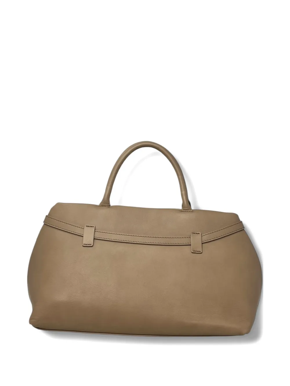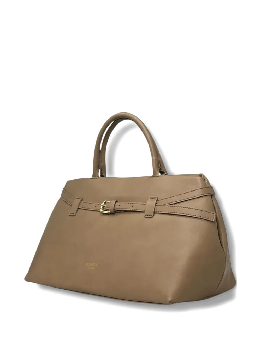 Светло-коричневые верхние ручки, фурнитура золотистого цвета, пряжка, декоративные ремешки, застежка на молнии сверху