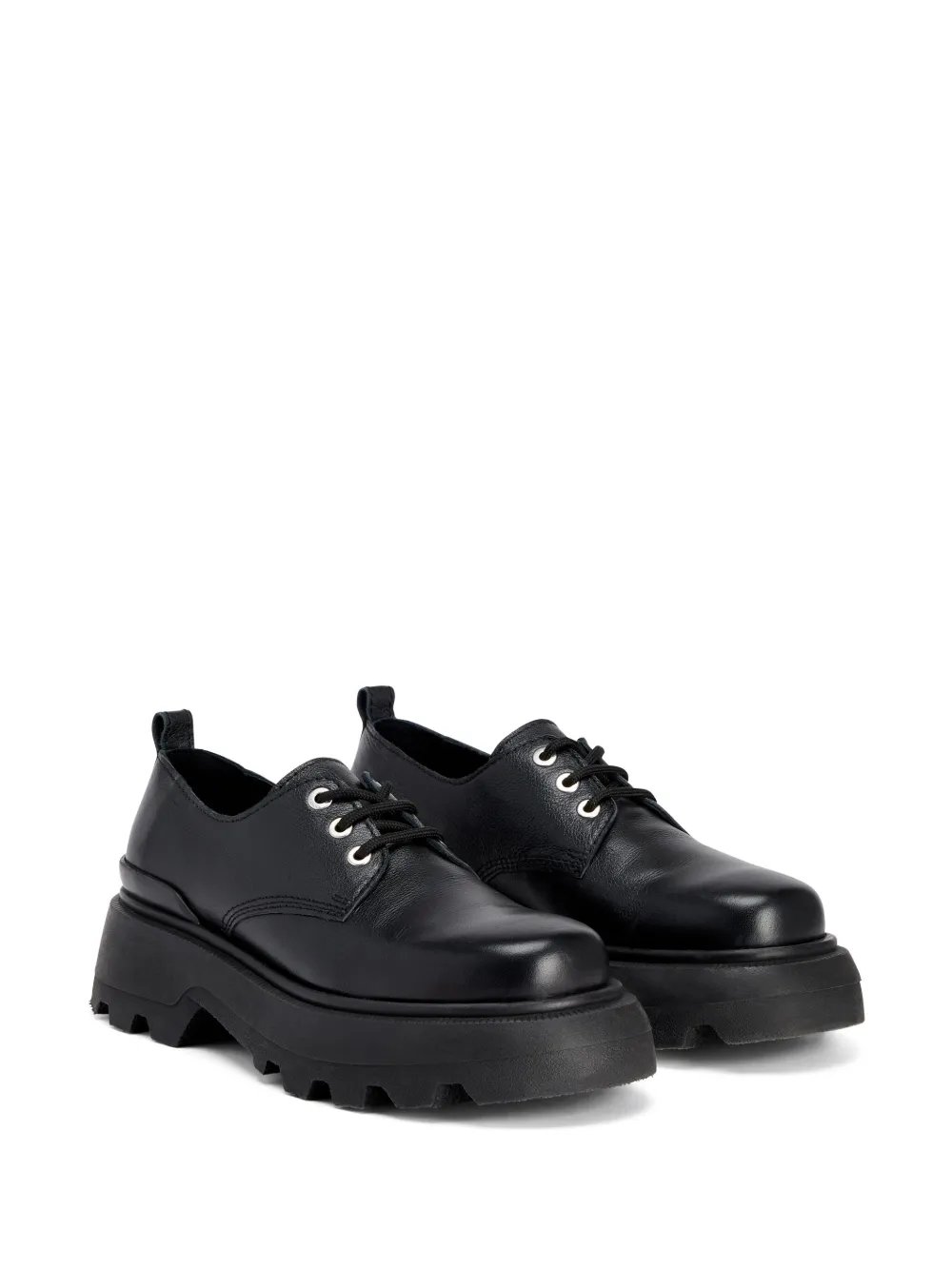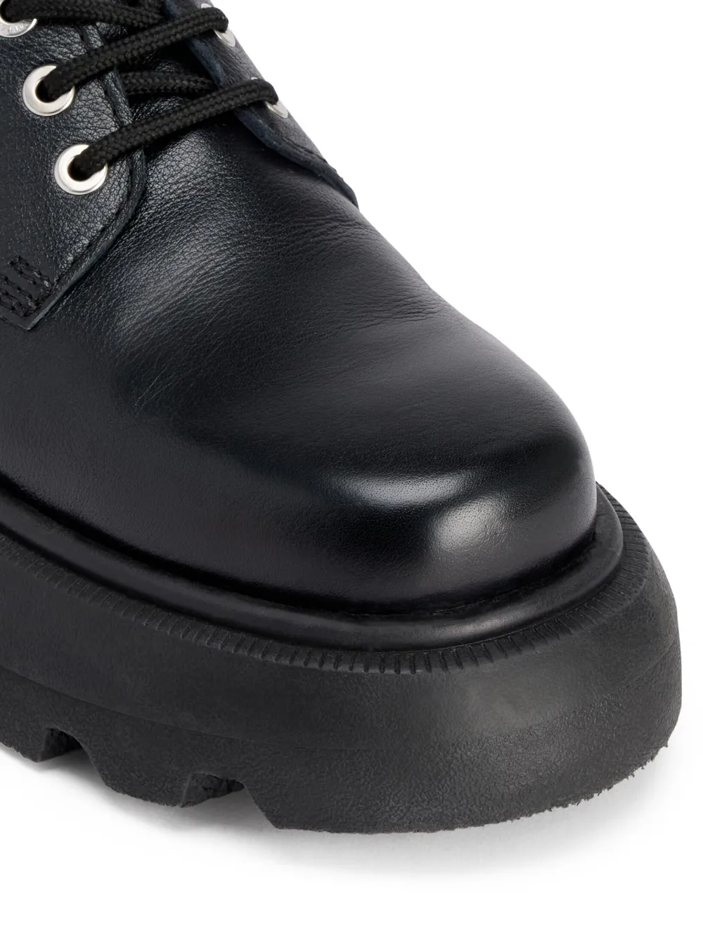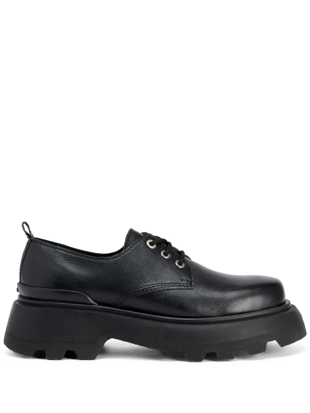 Черный, кожа, закругленный носок, шнуровка спереди, стелька с логотипом, рифленая резиновая подошва и каблук средней высоты.