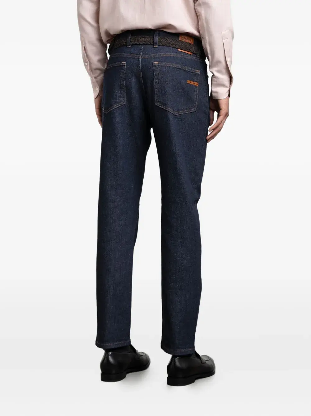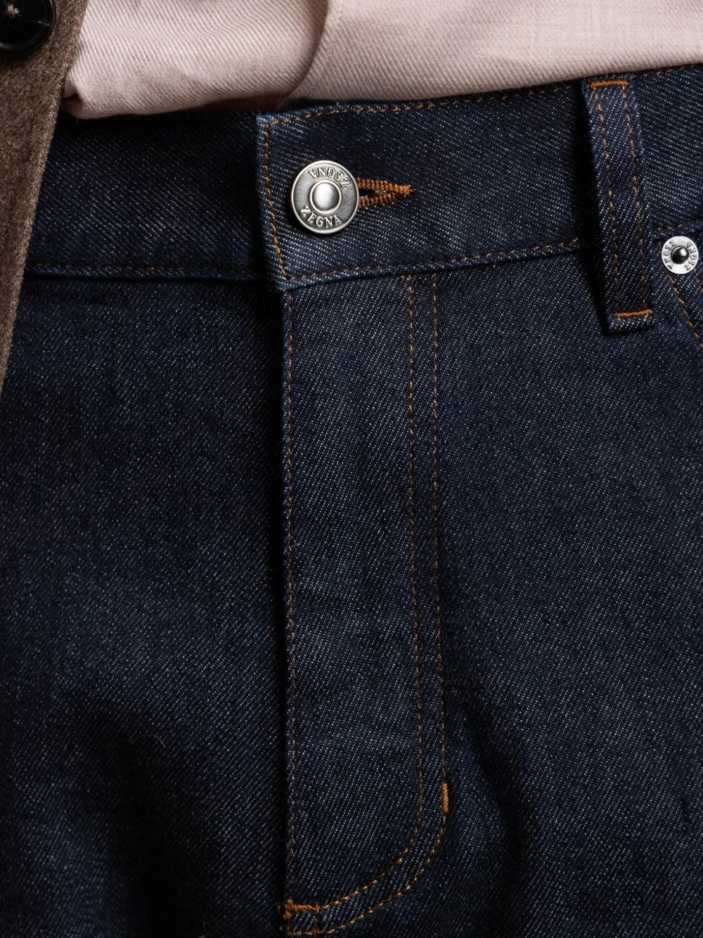 Темно-синяя джинсовая ткань, шлевки для пояса, пять карманов