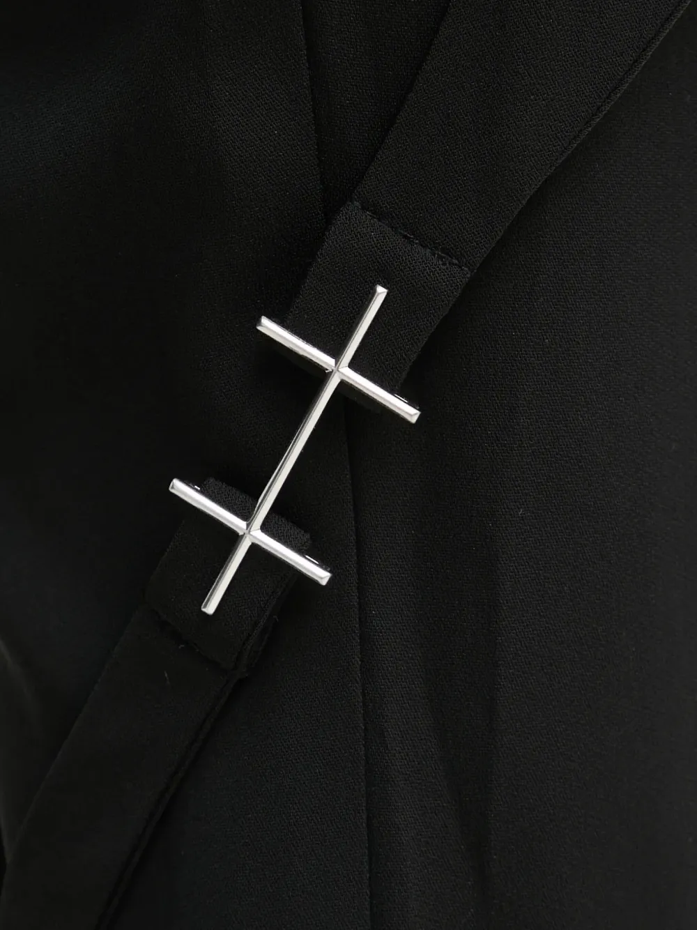 Черные ремешки, фурнитура серебристого цвета, прорезные карманы сзади