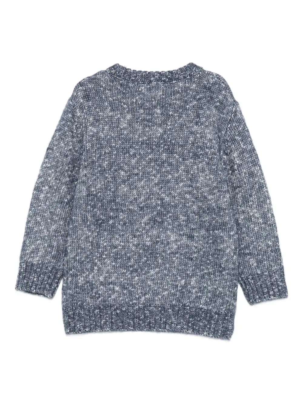 Синяя вязаная конструкция, круглый вырез, длинные рукава, нашивка с логотипом