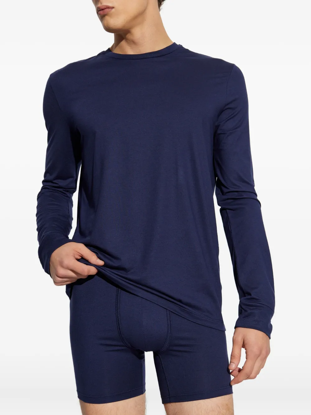 Темно-синяя толстовка с круглым вырезом, длинными рукавами и нашивкой с логотипом