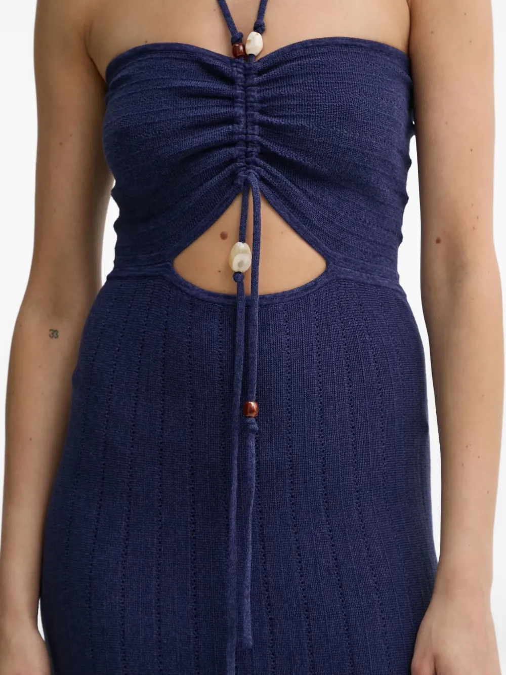 Синий топ с вырезами, драпировкой, на шее, украшением из бусин, в рубчик, трикотаж