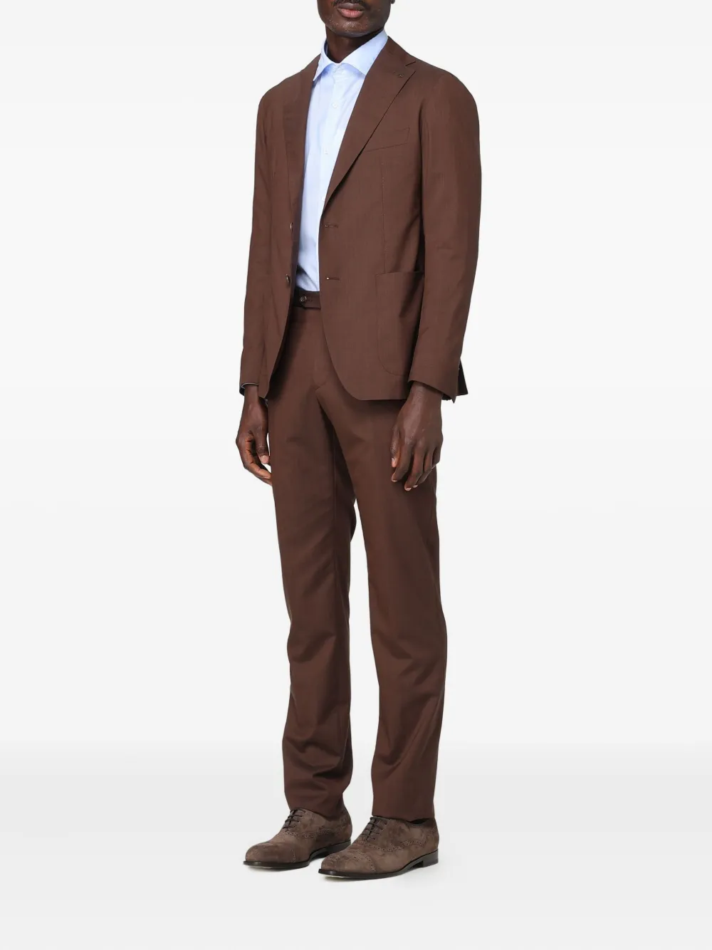Коричневый пиджак с двумя пуговицами, накладными карманами и заостренными лацканами